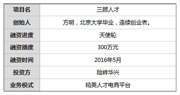去年3月,方明着手筹划项目。令他颇感意外的是,项目刚成立,险峰华兴就伸来橄榄枝。5月,三顾人才即完成了来自险峰华兴的300万元天使轮融资。“很吃惊,当时整个创投市场还处在资本寒冬,我们的项目Demo都没做出来,没想到这么快就确定签约。”