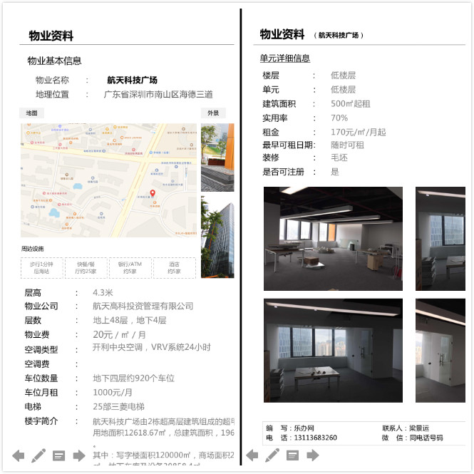 顾客可通过乐办网微信公众号、官网、400热线发布需求,经纪人经后台匹配后与其直接沟通需求,在1小时内向对方发送3套平台上适合房源楼书(样式如下图)。签订租赁合同后,经纪人会对顾客持续追踪,拓展行政类、法律类租后服务。现阶段,平台已同30余家第三方服务机构达成合作。