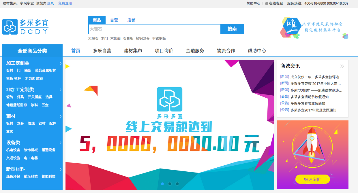 去年6月,多采多宜1.0版商城上线,彼时,商城已经获得由50家装饰公司提供的400多家核心优质供应商。采购方在商城注册登录后,选择商品品类,提交目标价格。随后商城服务人员便会为采购方询问供应商的报价。