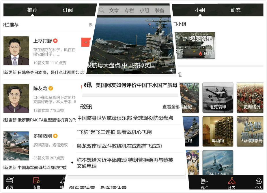2.0版本的“看军事”App定位是互动社区。不同于1.0版本中内容(资讯、文章)模块与用户互动模块相分离状态,此版本将资讯、专栏文章、用户发帖置于首页这一相同浏览页面中。“使用户的自生产内容出现在首页,有效提高了他们发帖的活跃度。”