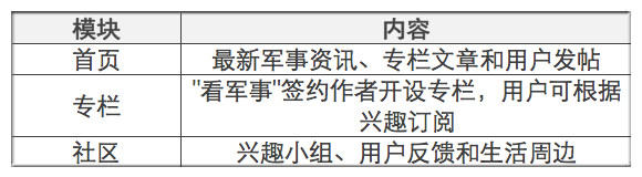 “看军事”是一款垂直军事内容的App,主要面向25~35岁年轻军事迷,为其提供资讯、文章(原创或KOL授权发布)、互动交流等服务。