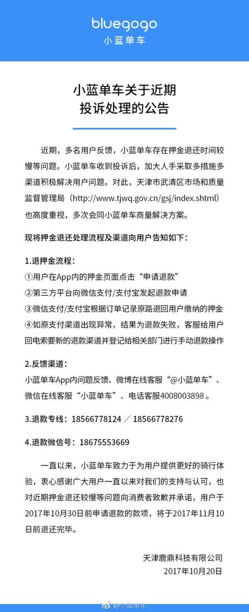 进入10月,用户退款投诉的声音越来越大。10月20日,小蓝单车在官微发表声明,将会加大人手采取多措施多渠道解决用户退款问题。小蓝单车创始人李刚则向媒体回应:将在接下来的十天全部解决。其上周也曾向媒体透露,本周将会发布新的融资消息。