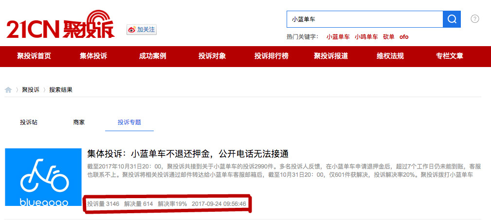 然而,十天过去了。没有等到小蓝的融资消息,用户投诉的声音却越来越响。据多家媒体报道,公益性网络媒体消费投诉服务平台“聚投诉”的数据显示,截止10月30日下午3点,小蓝单车因为押金难退的全国投诉量达到2810件,位列投诉排行榜第一,解决率仅为20.5%。“聚投诉”拨打小蓝单车400客服热线无人接听,其官网联系方式及企业年报中的企业联系电话,已提示无法接通。