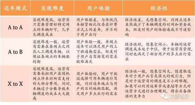 从取还车模式的角度来看,现有的汽车分时租赁运营商大致采取3种不同的取还车方式:A to A, A to B, X to X,即固定同网点取还车、固定异网点取还车以及随机还车。三种不同的取还车模式从不同的角度看,各有利弊。