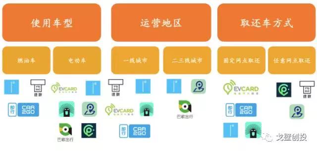 戈壁创投针对国内现有的以汽车分时租赁作为主营业务的公司进行了统计分析,并根据使用车型、运营地区以及取还车方式三个维度对它们进行了大致的分类。之所以选取这三个维度,是因为它们是基于合理运营效率前提下,影响汽车分时租赁运营商的成本结构模型的最大因素,而成本结构模型也反映出运营商对于各类相关资产的调度和处置能力,从而直接决定了运营商们是否能够将业务持续、健康、有效地开展下去。