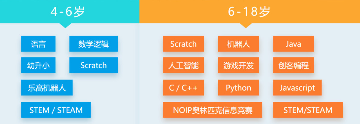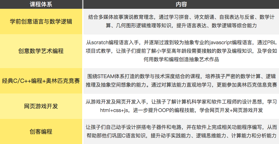 团队师资团队由哥伦比亚大学、北师大、华东师大背景的教研专家及顾问组成,由国内重点高校的相关专业硕士生授课,目前教师团队已达数百人。课程采用“线上真人直播课+线下项目协作课”形式进行,内容包含学前创意语言、学前创意数学逻辑、创意数学艺术编程、NOIP编程竞赛、网页游戏编程、创客编程等。具体课程体系如下: