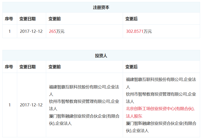 如上图所示,北京联帮在线教育科技有限公司(简称“联帮在线”)在今年12月12日,新增一家法人股东:北京创新工场创业投资中心(有限合伙);同时,公司注册资本由265万元扩充至302.8571万元。