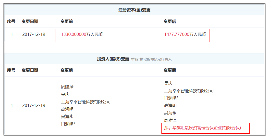 2017年12月19日,如卧(上海)智能科技有限公司的注册资本有由1330万元增加至1477.7778万元,并新增1家企业股东——深圳华旗汇晟投资管理合伙企业(有限合伙),据了解,该投资机构为华旗盛世投资实体。详见下图: