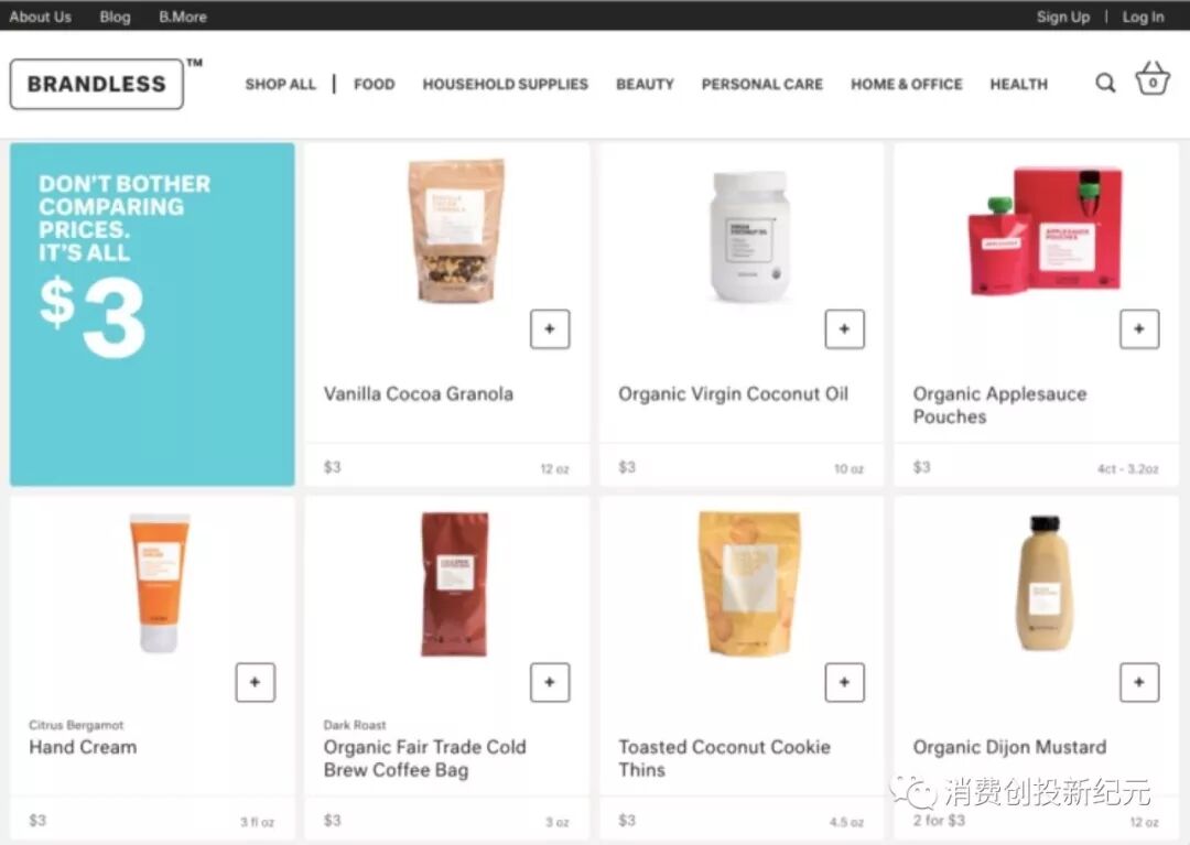 还有一个后起之秀:Brandless (主打日用消费品,主要创新点在于$3的各类产品,和富有设计感的包装),未上线前已经拿到$5000 万美金的投资。