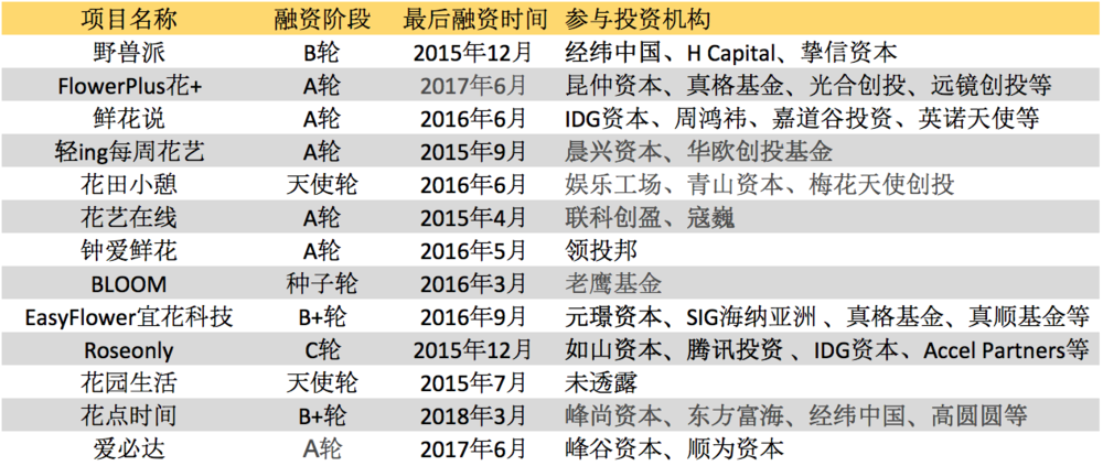 鲜花项目也不乏成功者。在近百家鲜花创业项目中脱颖而出的项目为野兽派、宜花科技、FlowerPlus与花点时间。从融资时间来判断,野兽派、鲜花说与宜花科技在整体运营上已上轨道,暂时不需要透过融资来协助业务增长。鲜花订阅服务的花点时间则是在2个月前获得峰尚资本的B+轮融资,该项目除了资金流优势以外,还有明星高圆圆的影响力加持。