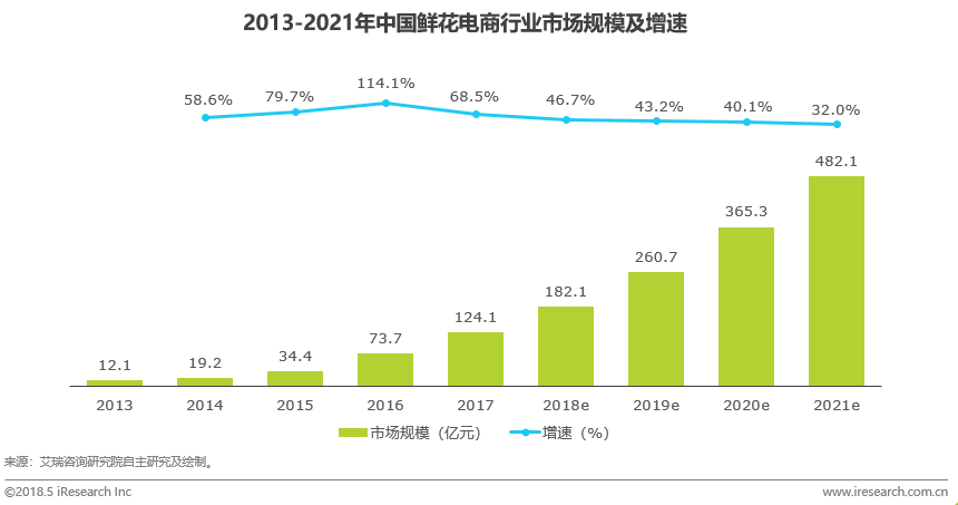 根据艾瑞咨询(iResearch)的调查,2017年中国鲜花电商行业总体市场规模为124.1亿元。随着消费习惯的养成,加上冷链物流等基建设施的完善成熟,预计2021年市场规模接近500亿元。2013至2017年期间,鲜花电商领域共完成融资47笔,大部分是集中在B轮以前的中早期投资,相对应融资金额以千万级及以下居多。