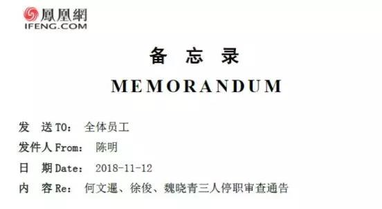 11月12日,媒通社(ID:mts1000)独家获悉,凤凰网内部反腐动作频频,负责财务、人事、行政及法律工作的凤凰新媒体副总裁陈明于当日向全体员工发送了一份《停职审查通告》,该通告明文指出: