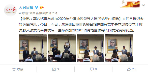 铅笔道4月17日讯,今日,鸿海集团董事长郭台铭在国民党中央党部接受党主席吴敦义颁发的荣誉状后,宣布参加2020年台湾地区领导人国民党党内初选。