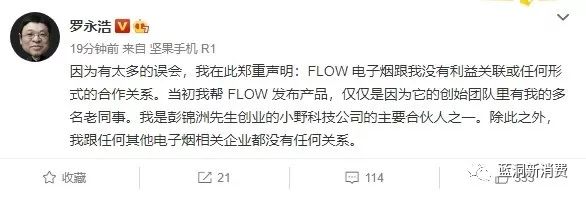 因为有太多的误会,我在此郑重声明:FLOW电子烟跟我没有利益关联或任何形式的合作关系。当初我帮FLOW发布产品,仅仅是因为它的创始团队里有我的多名老同事。我是彭锦洲先生创业的小野科技公司的主要合伙人之一。除此之外,我跟任何其他电子烟相关企业都没有任何关系。