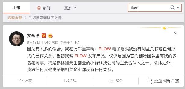 9月26日消息,大约10天前的9月17日,罗永浩在微博上突然发布了一则与朱萧木和福禄FLOW电子烟划清界限的微博,声明与上述两者没有关系,只和小野电子烟和彭锦洲有关系。