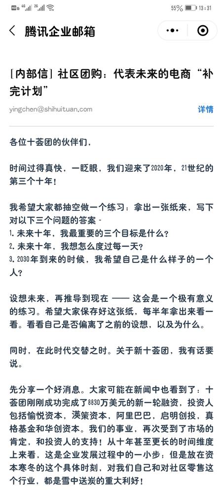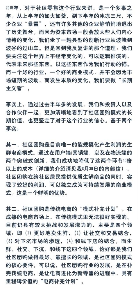 针对本次融资,十荟团创始人陈郢向全体员工发出内部信。他在信中表示,社区团购目前仍然是生鲜电商唯一能获得利润的模式。社区团购代表了未来电商的“补完计划”,基于此他提出了四个新的发展方向:生鲜、社交、下沉、线下。具体而言,即:更好地卖生鲜、让社交和交易结合、对下沉市场的渗透以及与线下店结合。