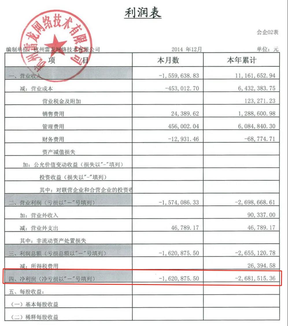 雷龙公司2014年度财务报表,证明2014年度雷龙公司巨额亏损。