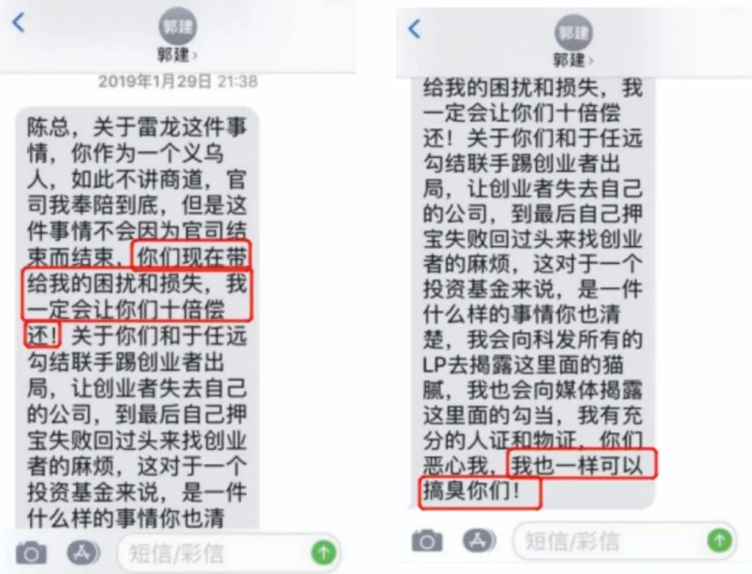 此外,早在2019年1月29日诉讼刚刚发生之时,郭建就发短信给陈晓锋,威胁说“你们带给我的困扰和损失,我会让你们十倍偿还!”,还声称“会向媒体揭露并搞臭你们!”(见附件十七)他试图通过这样的威胁,让我们退缩。同时他也向其他人发送信息,对陈晓锋进行侮辱、攻击及威胁。