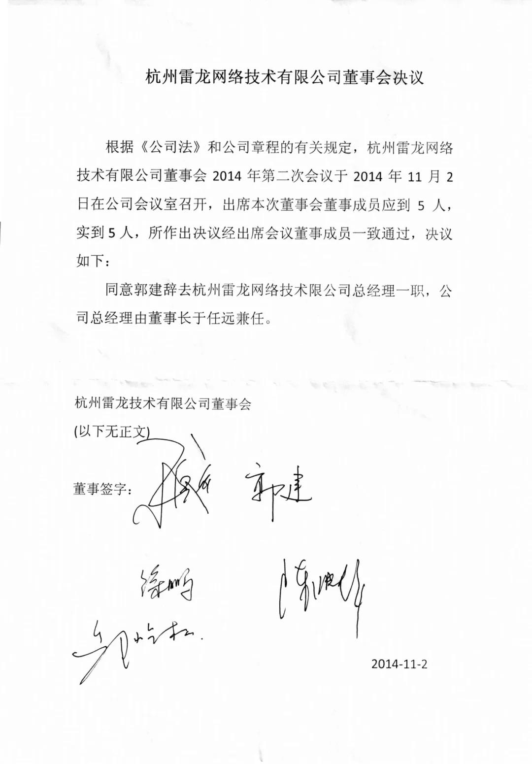 雷龙公司2014年11月2日的董事会决议,证明郭建主动辞职,全体董事一致同意。雷龙公司董事会共5位董事,分别为郭建、徐鹏、邬屹松、于任远和陈晓锋。徐鹏为郭建招聘的公司员工,是郭建的得力干将,在郭建辞职离开雷龙公司后,徐鹏也从雷龙公司离职,与郭建一起创业。邬屹松虽为独立董事,也是郭建推选的,且作为郭建的关键证人专程赶来为其出庭作证。由此可见,陈晓锋和于任远是没有能力逼迫其辞职的。