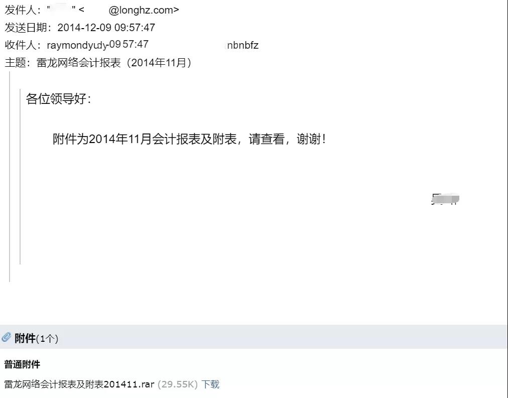 雷龙公司于2014年12月9日发送的关于2014年11月公司会计报表及附表的公司邮件,说明雷龙公司自2014年3月起收入逐月下降,最后趋近于无。