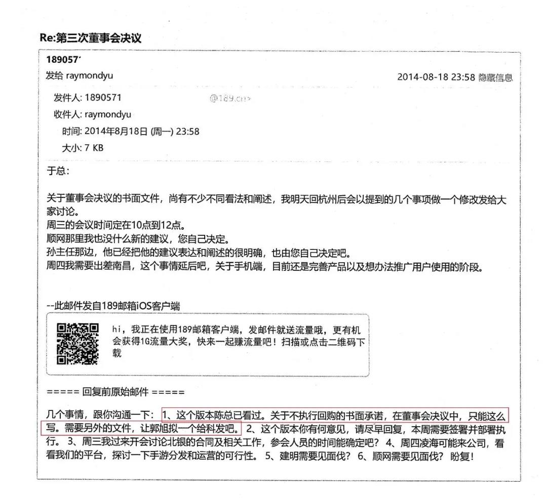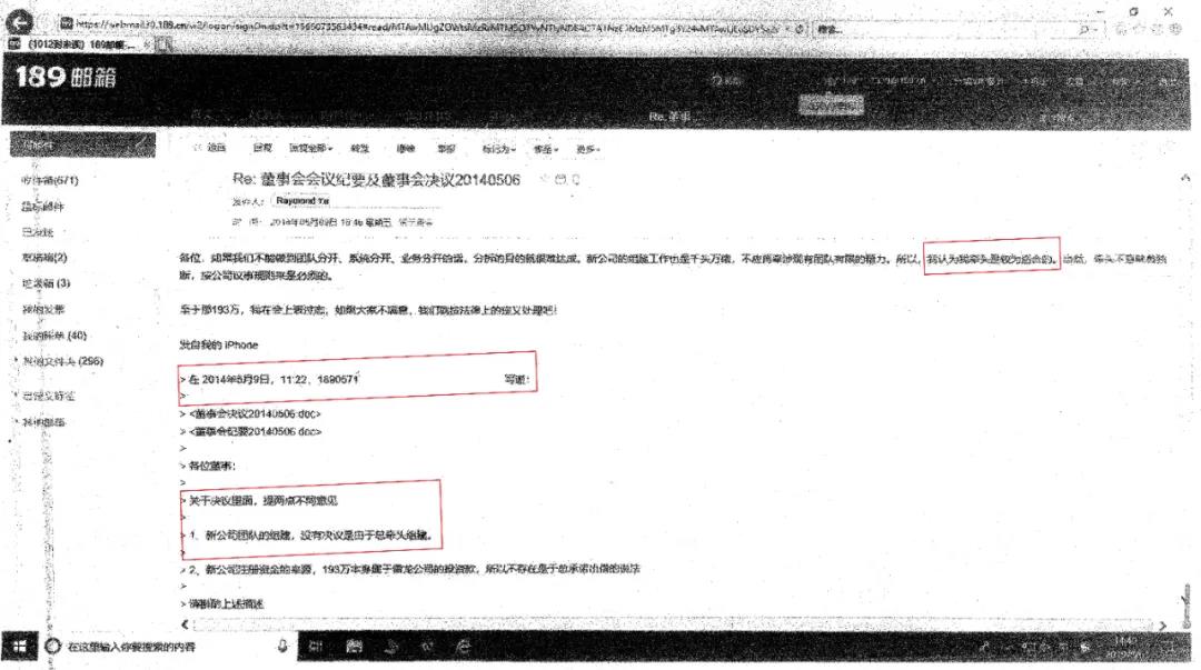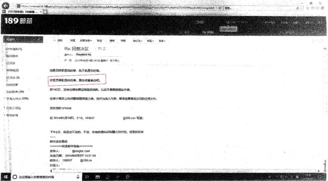 2014年5月10日雷龙公司股东间的往来邮件,源自郭建向法院提交的公证书。证明郭建已有辞职的想法。于任远在回复郭建的邮件中提到“你是否辞职是你的事,跟全体董事说吧。”
