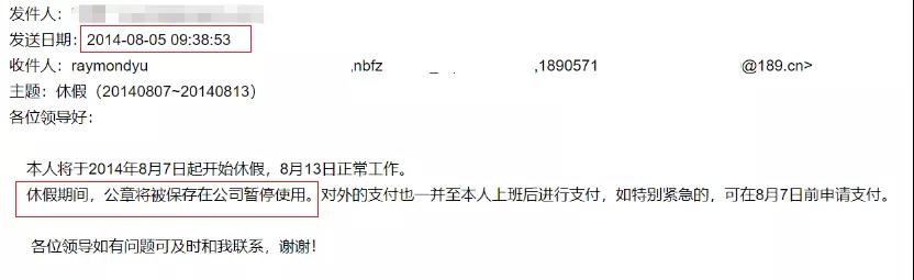 2014年8月5日雷龙公司发送的邮件,证明此时公章已经在公司了。