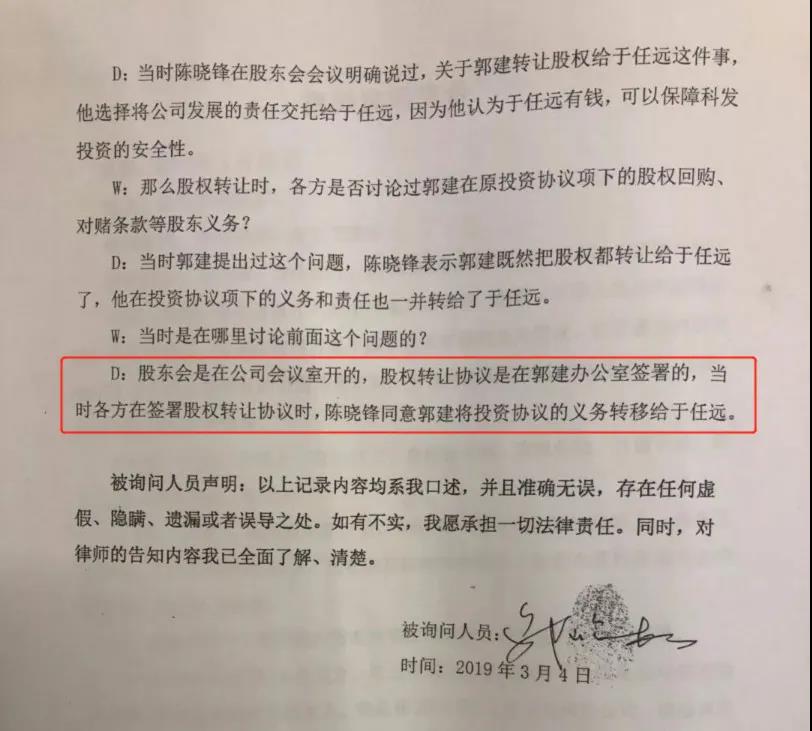 郭建声称在将股权转让给于任远的时候,陈晓锋口头承诺不会要求其承担回购义务。按理口说无凭,但郭建仍找到了“证人”邬屹松,其实从证人证言中,大家就可以发现其中的端倪。(见附件十六)