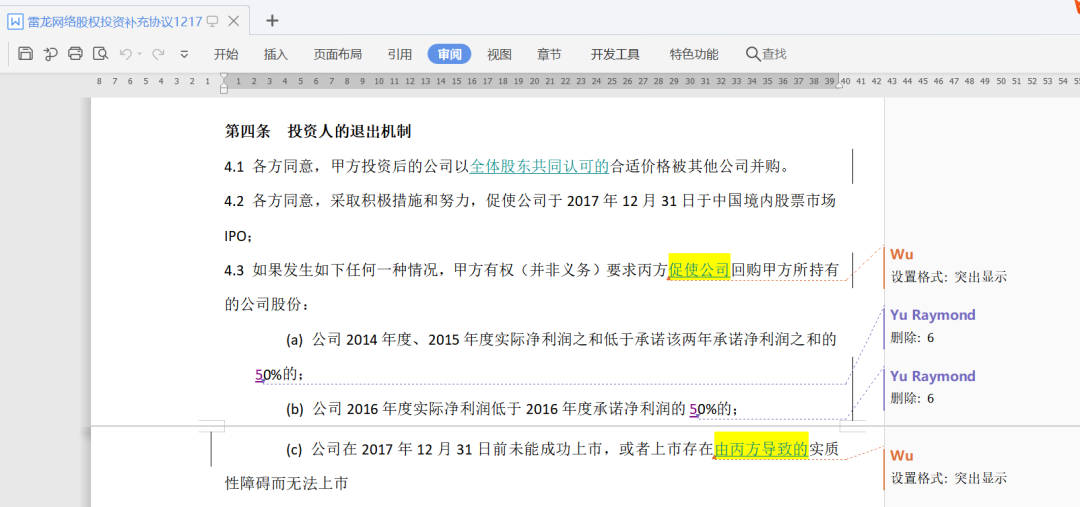 洽谈过程中的协议版本,因篇幅原因,仅提供某次版本的关键点修改意见的截图,标黄部分为丙方修改内容。
