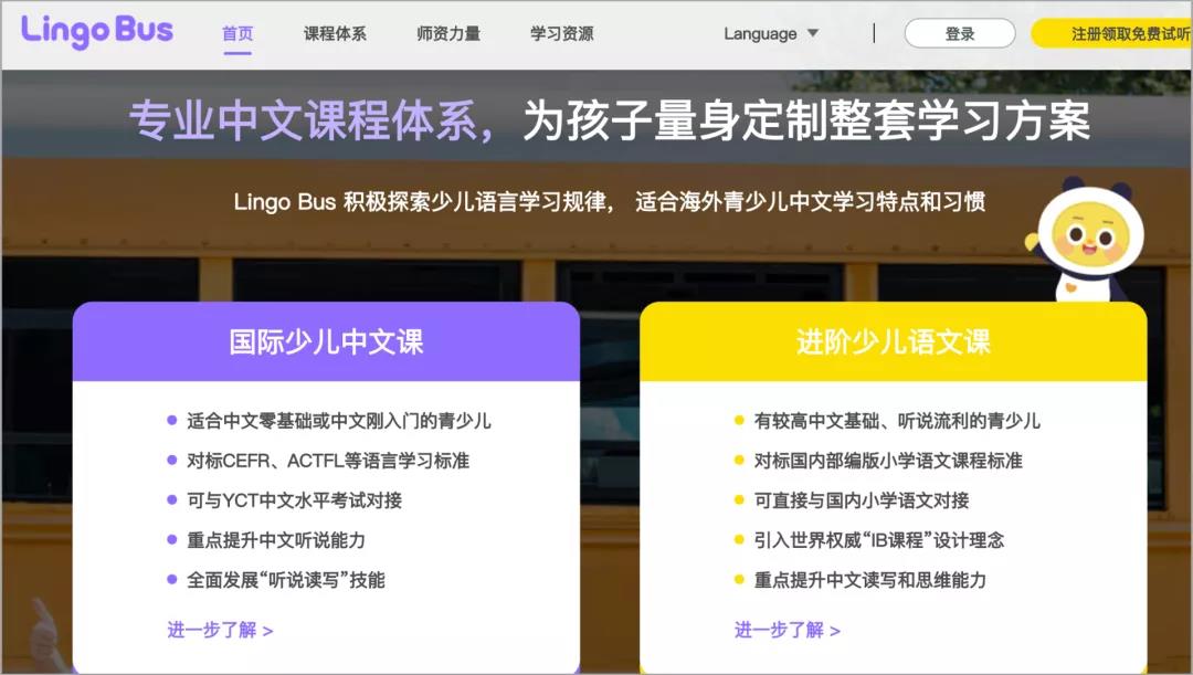 比如,少儿中文品牌 Lingo Bus 就设计了一套「专业中文课程体系」,根据海外青少儿不同学习阶段,提供了两种不同课程。