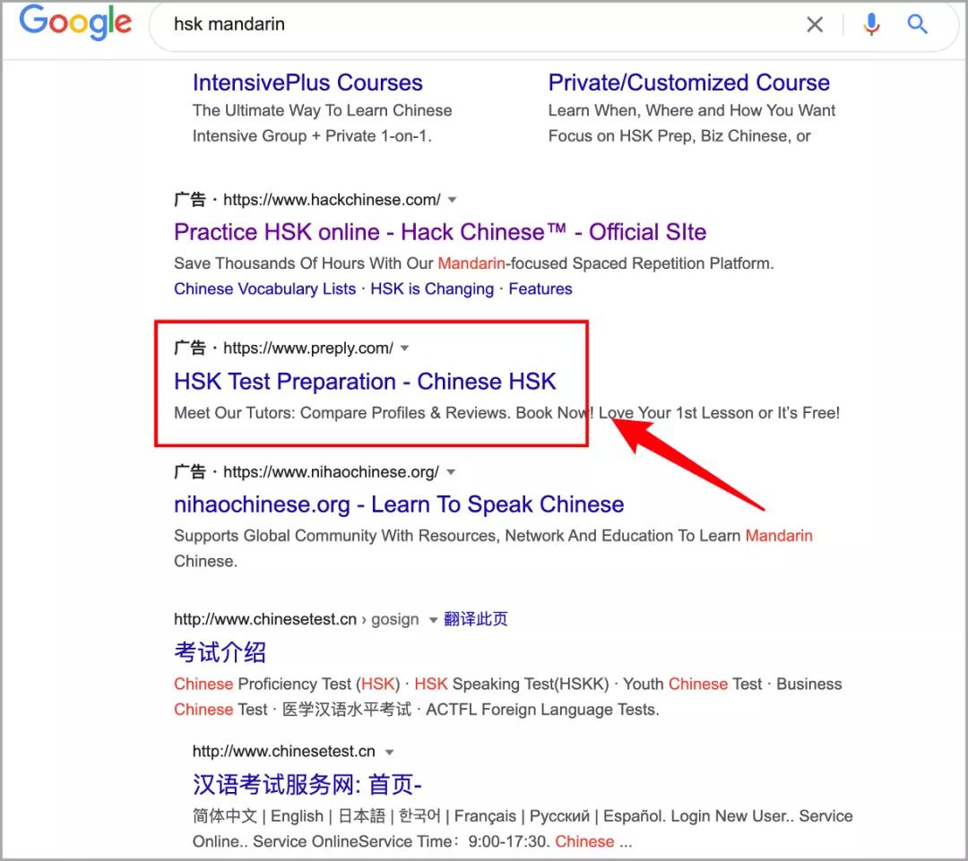 例如,用户在搜索了 HSK 汉语水平考试后,就会收到不少汉语考试培训的广告。