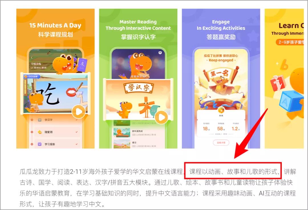 再比如,大力教育旗下的瓜瓜龙启蒙,开设了“趣味学中文”课程,用动画、故事、儿歌等趣味方式传讲解故事、国学等内容。