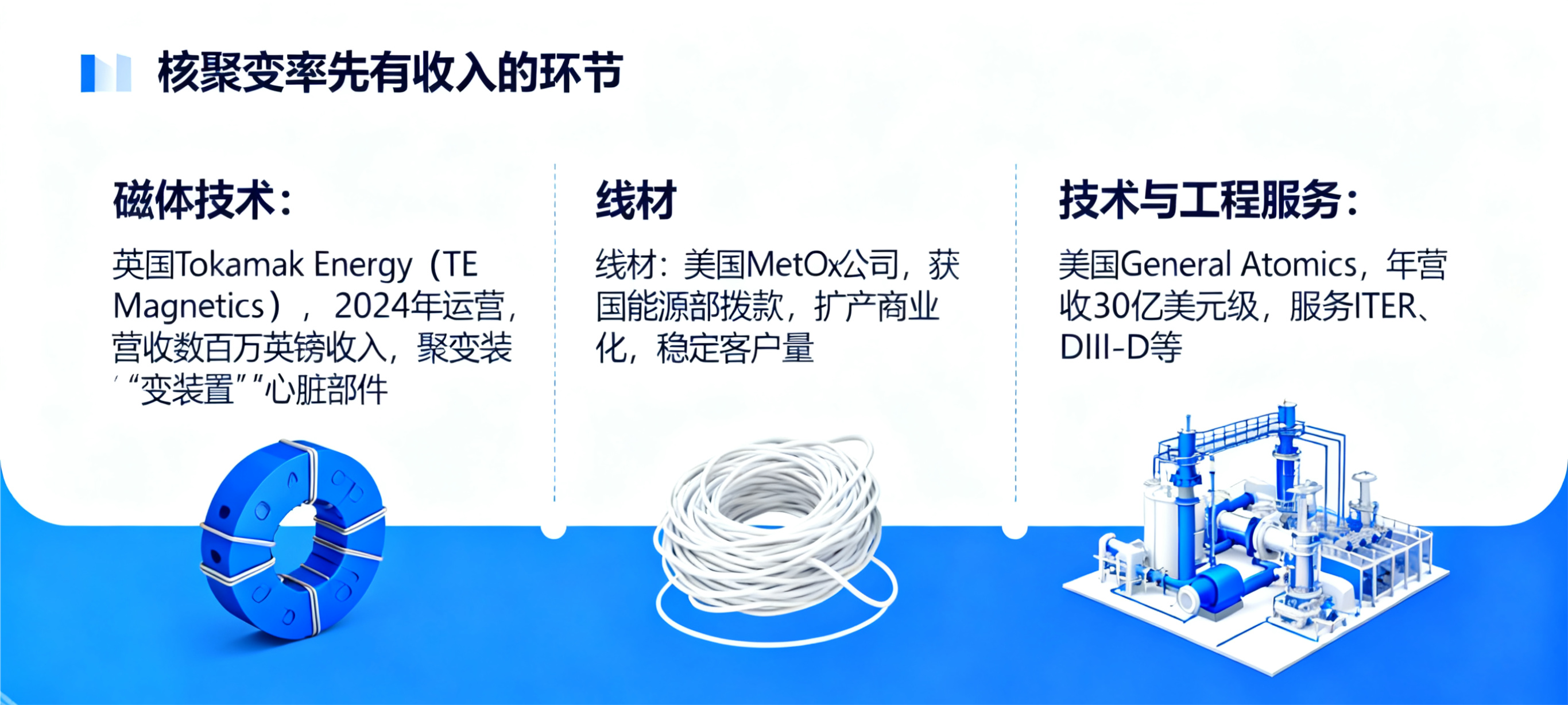 虽然距离“卖电”还很远,但是,这并不代表没有赚钱机会。事实是:不少公司已经在核聚变上有收入了,尤其是新材料、核心零部件环节。