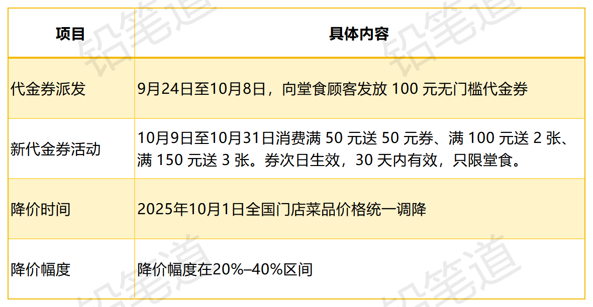 9月24日,西贝发起“西贝请您吃饭”活动,向到店消费顾客免费发放全国通用的100元无门槛堂食代金券。10月1日起,西贝在全国门店对30多道核心菜品实施降价,平均降幅约 20%,部分菜品降价幅度甚至接近40%。