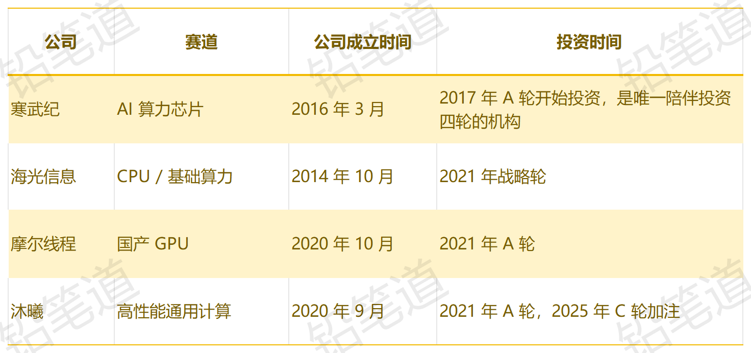 更惊人的是,我梳理后发现:有一家投资机构“独中四元”。什么意思?沐曦这样的超级独角兽,他们投中了4个:寒武纪、海光信息、摩尔线程、沐曦——都是3000亿-5000亿市值的AI芯片公司。