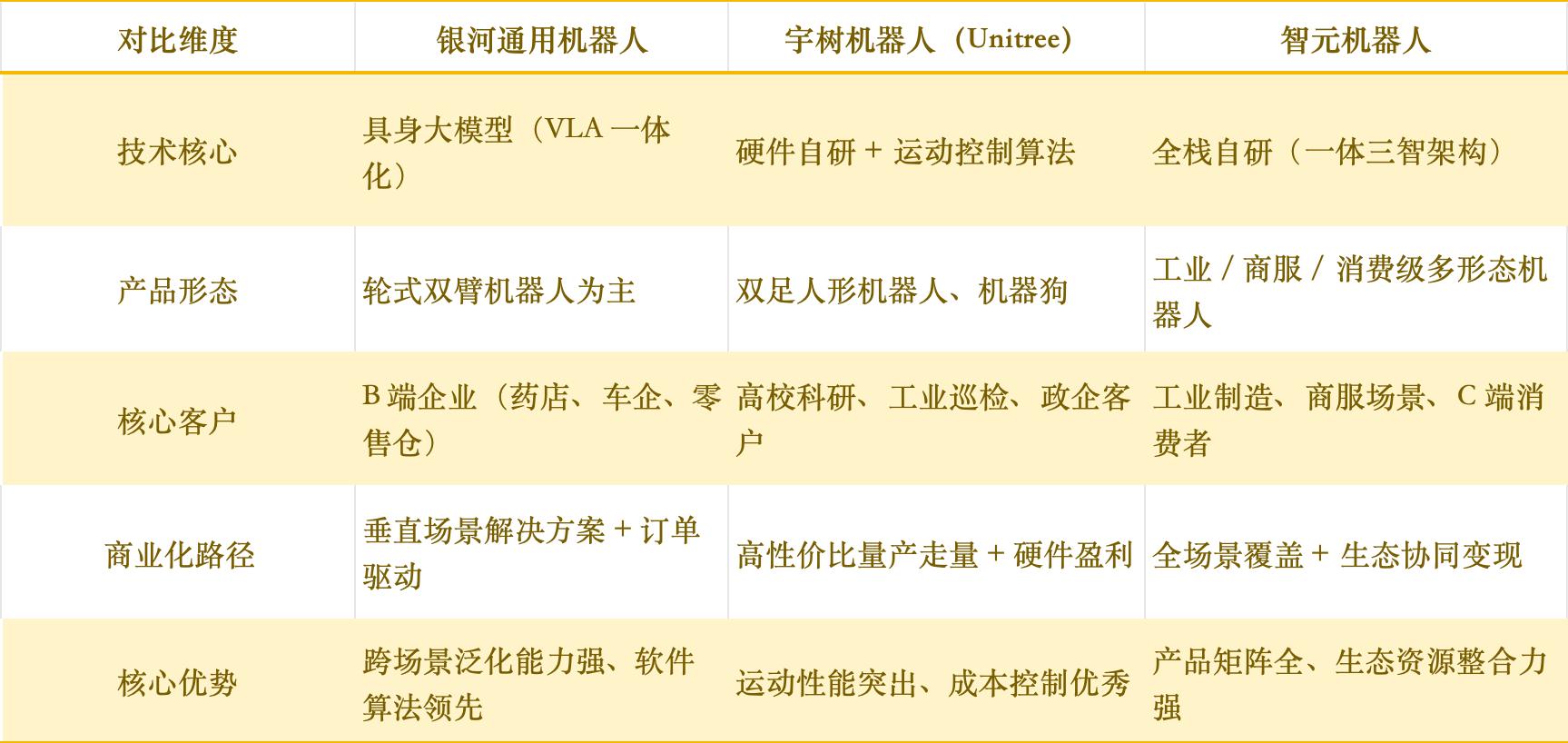 在这样的背景下,头部公司的分化开始显现。在国内具身智能第一梯队中,银河通用机器人、宇树科技、智元机器人同属领先阵营,但三家公司对“通用机器人的核心能力”理解不同,走出的技术路径也不一样。