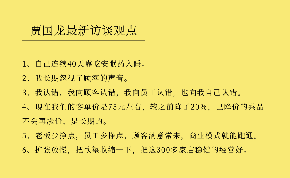 最近,铁汉脾气的贾国龙再度认错。接受《南方周末》采访时,他说:长期忽视了顾客的声音。