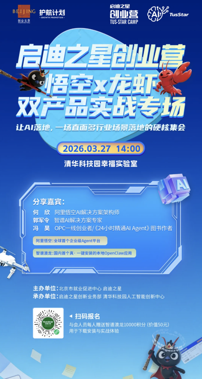 • 活动主题:启迪创业营之悟空×龙虾双产品实战专场