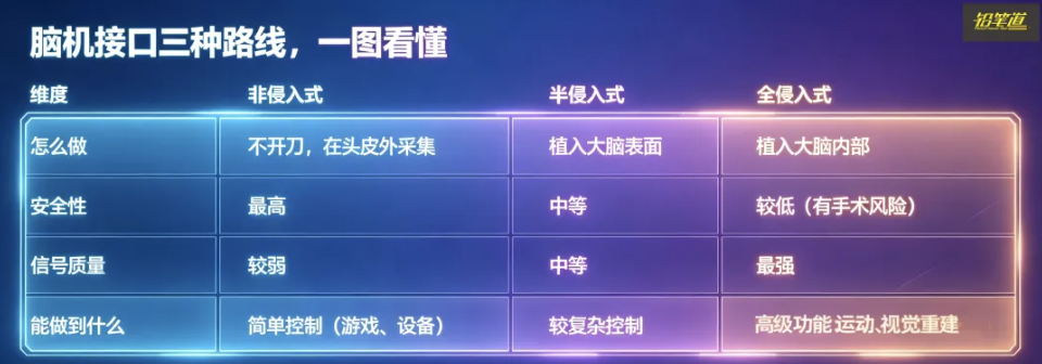 非侵入最容易商业化,已经可以卖产品了。半侵入在医疗场景里找平衡。全侵入最难,但上限最高——比如视觉重建这样复杂的能力,必须走全侵入。