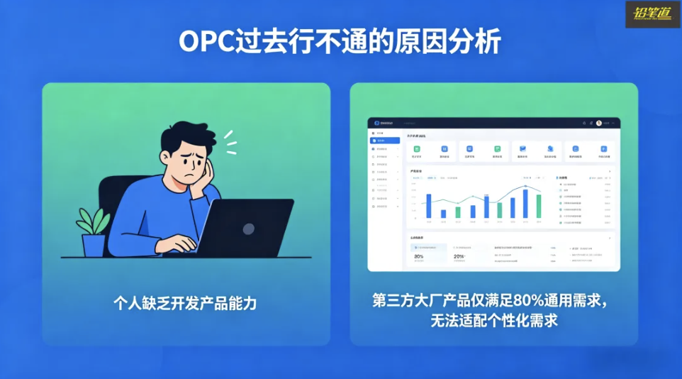 很多人会问,以前OPC为什么行不通?过去,要么个人缺乏开发产品的能力;要么找第三方大厂合作,而大厂的产品往往只满足80%的通用需求,无法适配个性化需求。