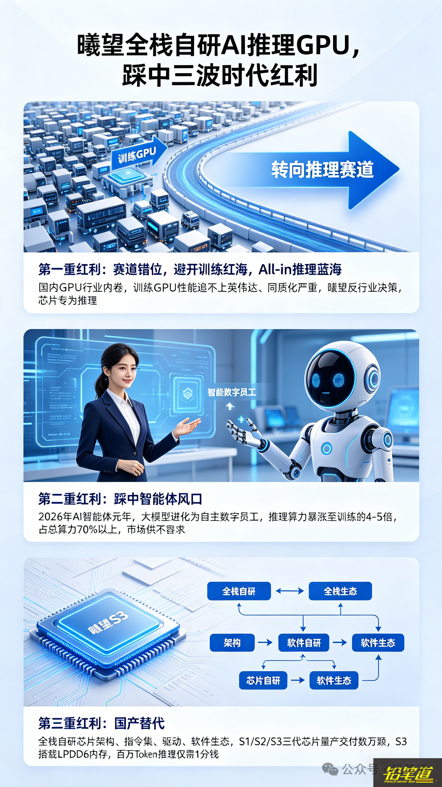 曦望实现了芯片架构、指令集、驱动、软件生态的全栈自研。S1、S2、S3三代芯片全部量产落地,已完成数万颗交付。最新的S3芯片,是国内第一款搭载LPDDR6内存的推理GPU,跑百万Token只要1分钱。